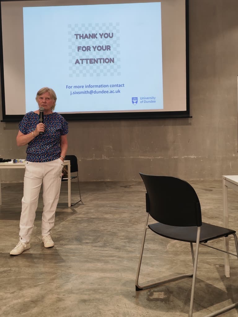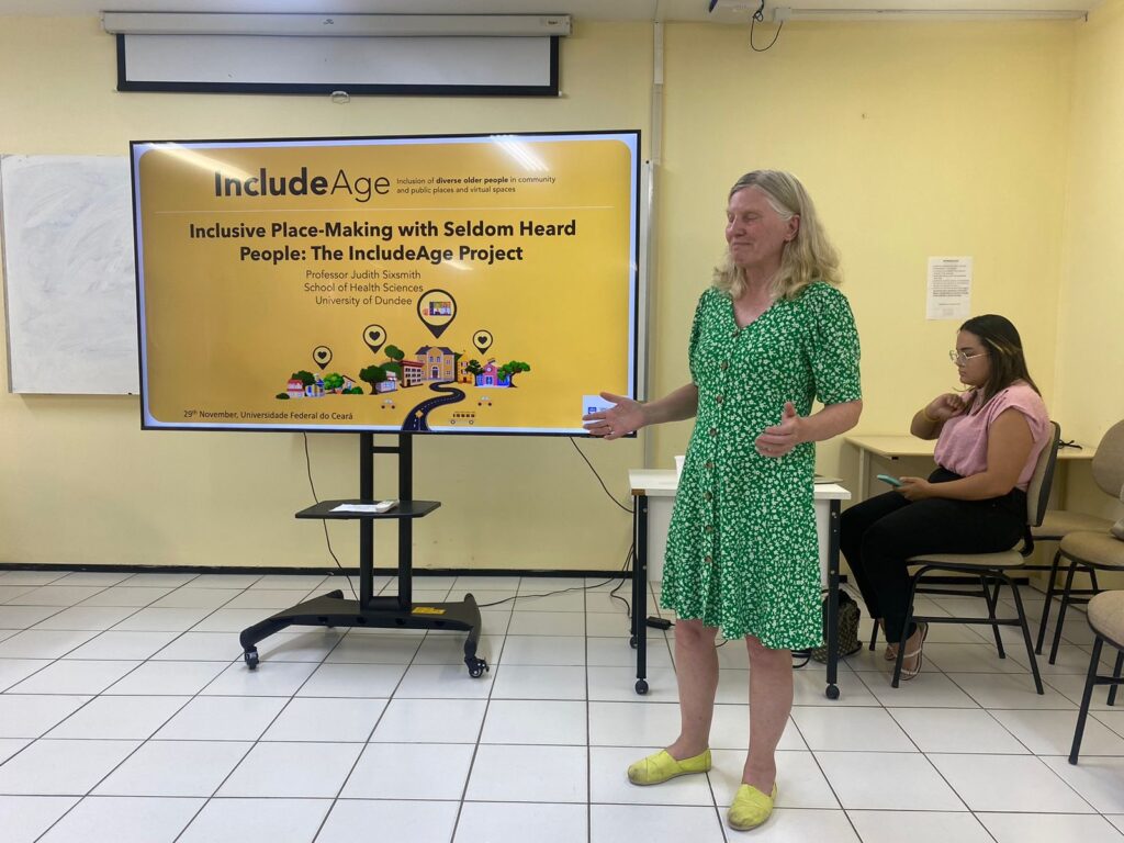 Photo of Judith Sixsmith, IncludeAge’s Principle Investigator, and new friends from the Universidade Federal do Ceara. Judith traveled to Brazil in November 2023 and presented on inclusive place-making with seldom-heard people to present at the university. See presentation HERE.